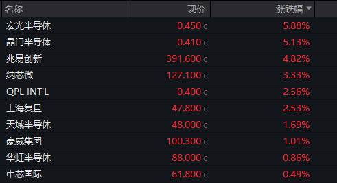 芯片股走强,兆易创新涨超5%,上海复旦涨超2%,中芯国际、华虹半导体涨超1%;