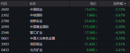 有色金属板块走低,中国铝业跌超5%,洛阳钼业跌超3%。