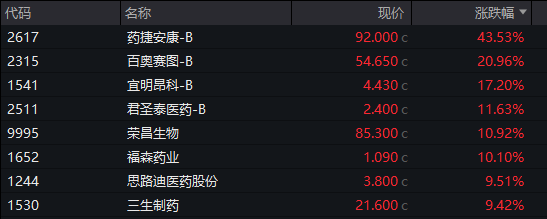 医药生物板块反弹,药捷安康-B大涨超43%,百奥赛图-B涨超20%,荣昌生物、三生制药等多股涨超9%;