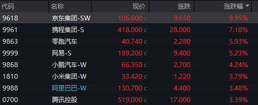 科网股普涨,京东集团涨近10%,网易涨超5%,阿里巴巴、腾讯控股涨超3%;