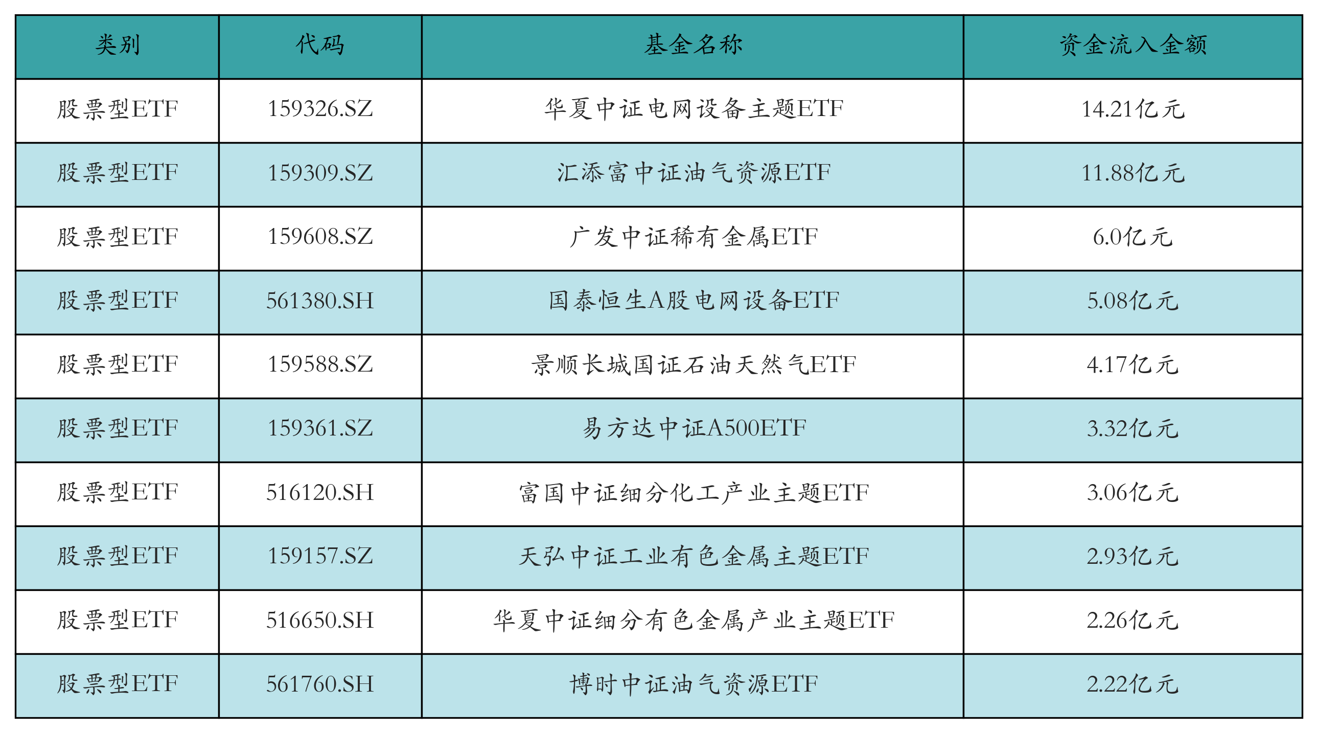 昨日股票型ETF资金流入最多的3只ETF及其流入金额分别为:华夏中证电网设备主题ETF(流入14.21亿元)、汇添富中证油气资源ETF(流入11.88亿元)、广发中证稀有金属ETF(流入6.0亿元)。资金流入前10详情见下表: