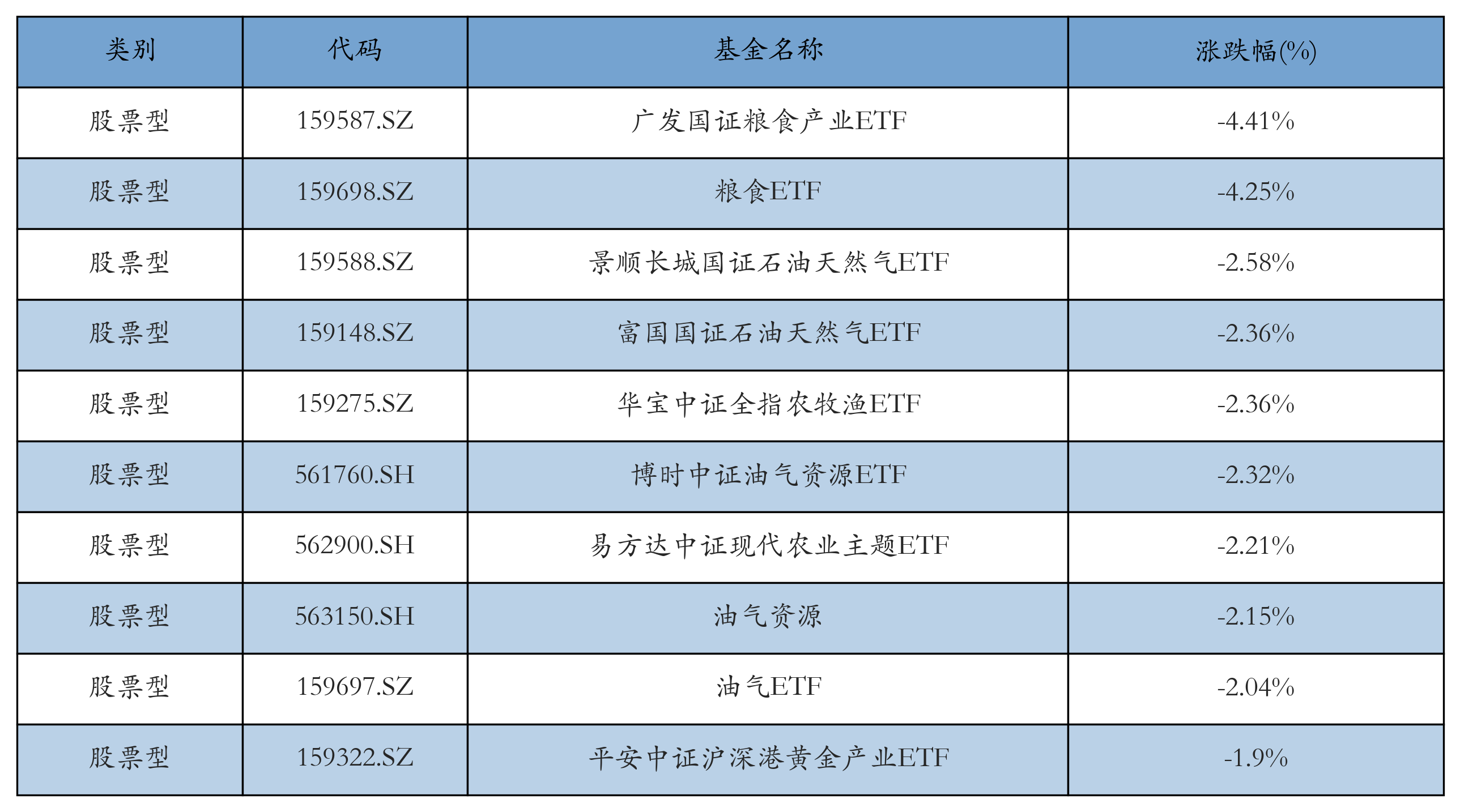 昨日股票型ETF跌幅最大的3只ETF及其收益率分别为:广发国证粮食产业ETF(-4.41%)、粮食ETF(-4.25%)、景顺长城国证石油天然气ETF(-2.58%)。跌幅前10详情见下表: