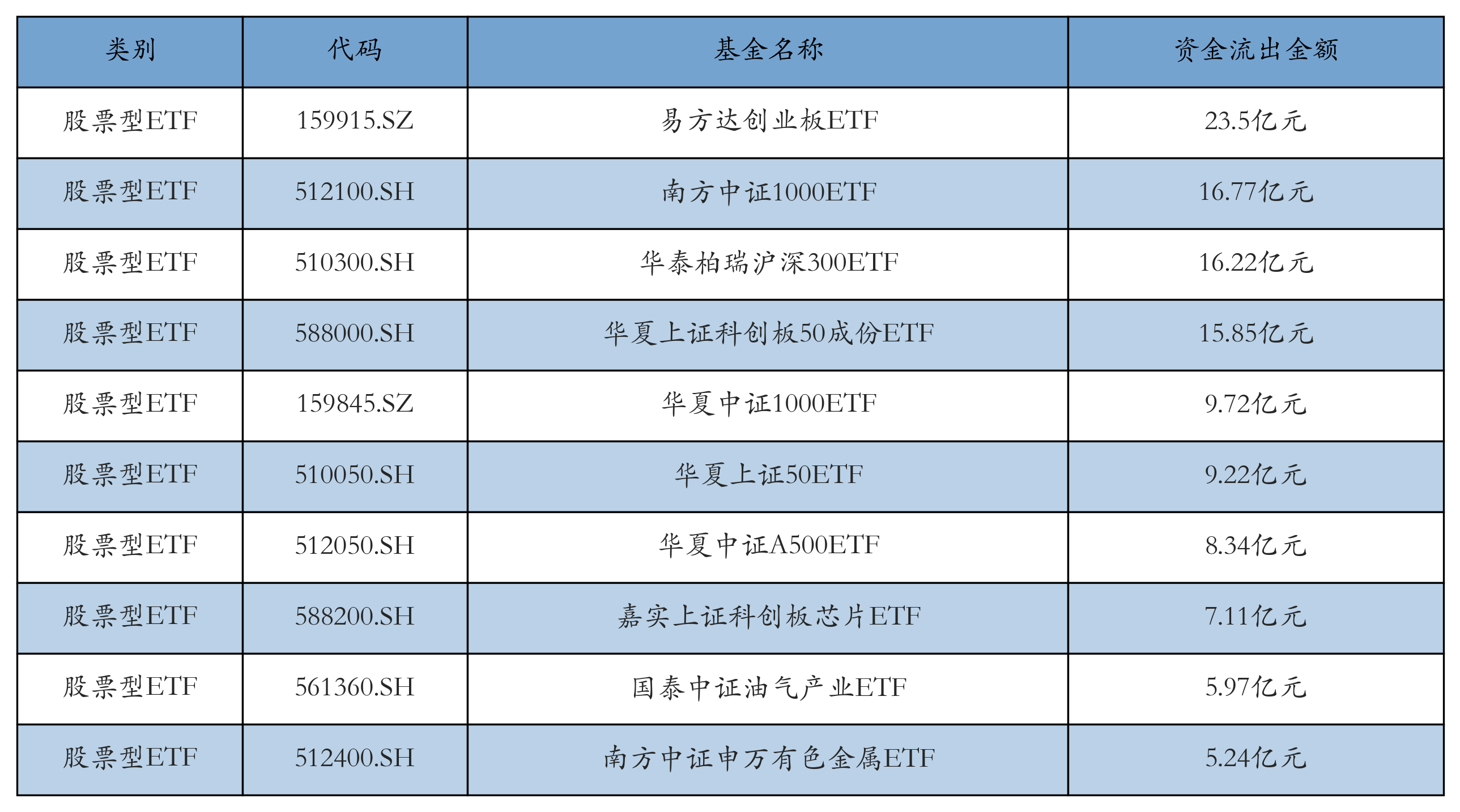 昨日股票型ETF资金流出最多的3只ETF及其流出金额分别为:易方达创业板ETF(流出23.5亿元)、南方中证1000ETF(流出16.77亿元)、华泰柏瑞沪深300ETF(流出16.22亿元)。资金流出前10详情见下表:
