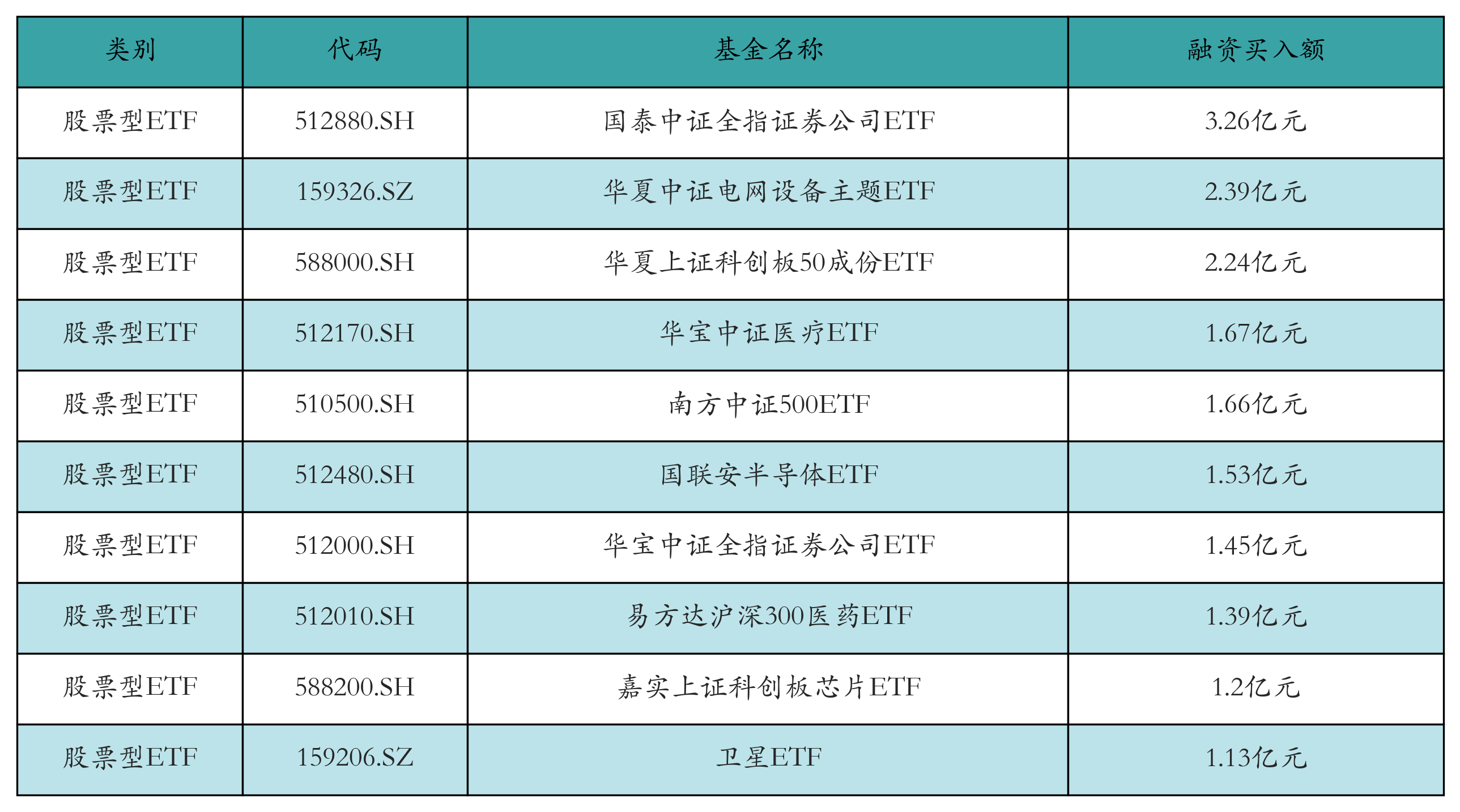 昨日股票型ETF融资买入额最高的3只ETF及其买入金额分别为:国泰中证全指证券公司ETF(3.26亿元)、华夏中证电网设备主题ETF(2.39亿元)、华夏上证科创板50成份ETF(2.24亿元)。融资买入额前10详情见下表: