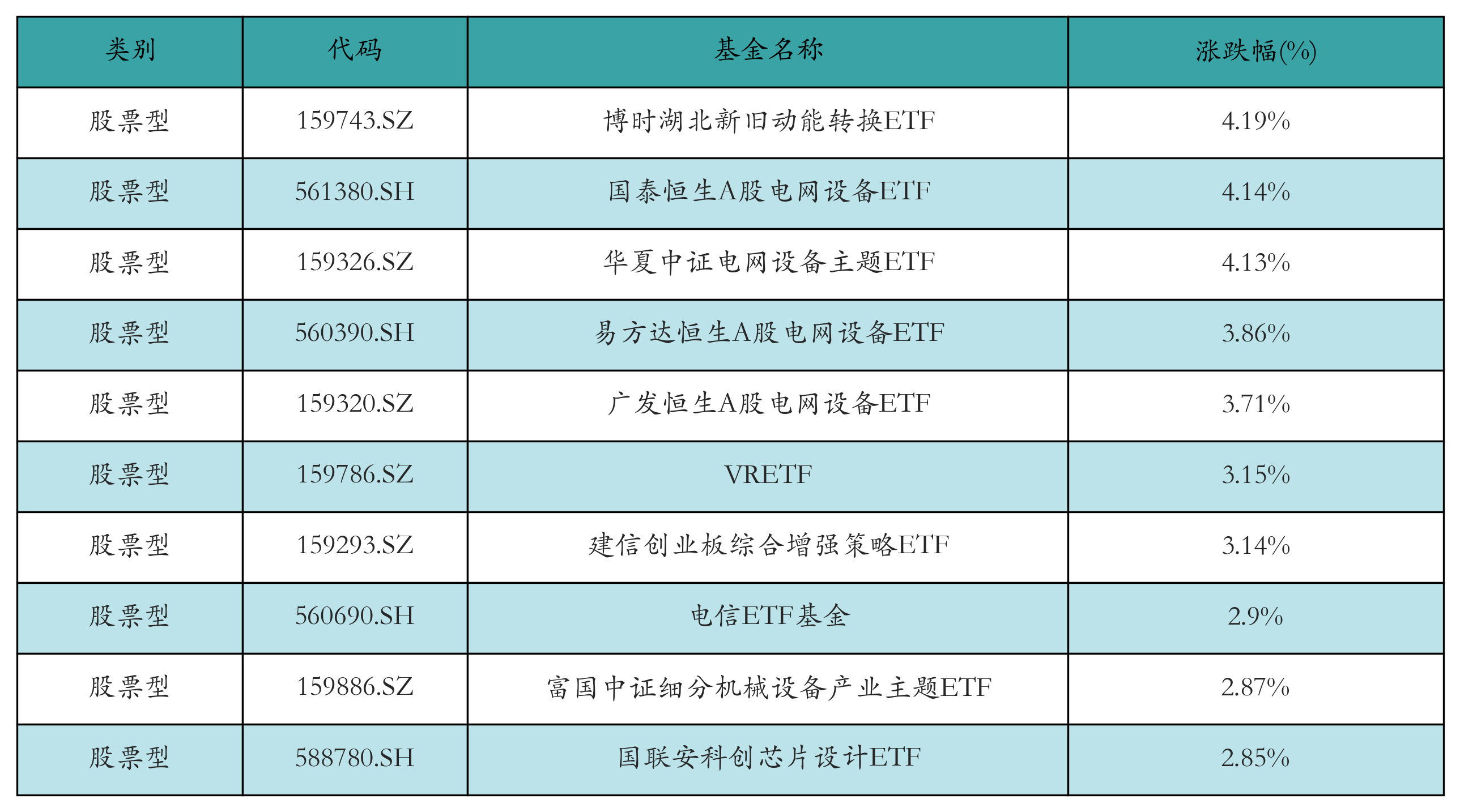 昨日股票型ETF涨幅最高的3只ETF及其收益率分别为:博时湖北新旧动能转换ETF(4.19%)、国泰恒生A股电网设备ETF(4.14%)、华夏中证电网设备主题ETF(4.13%)。涨幅前10详情见下表: