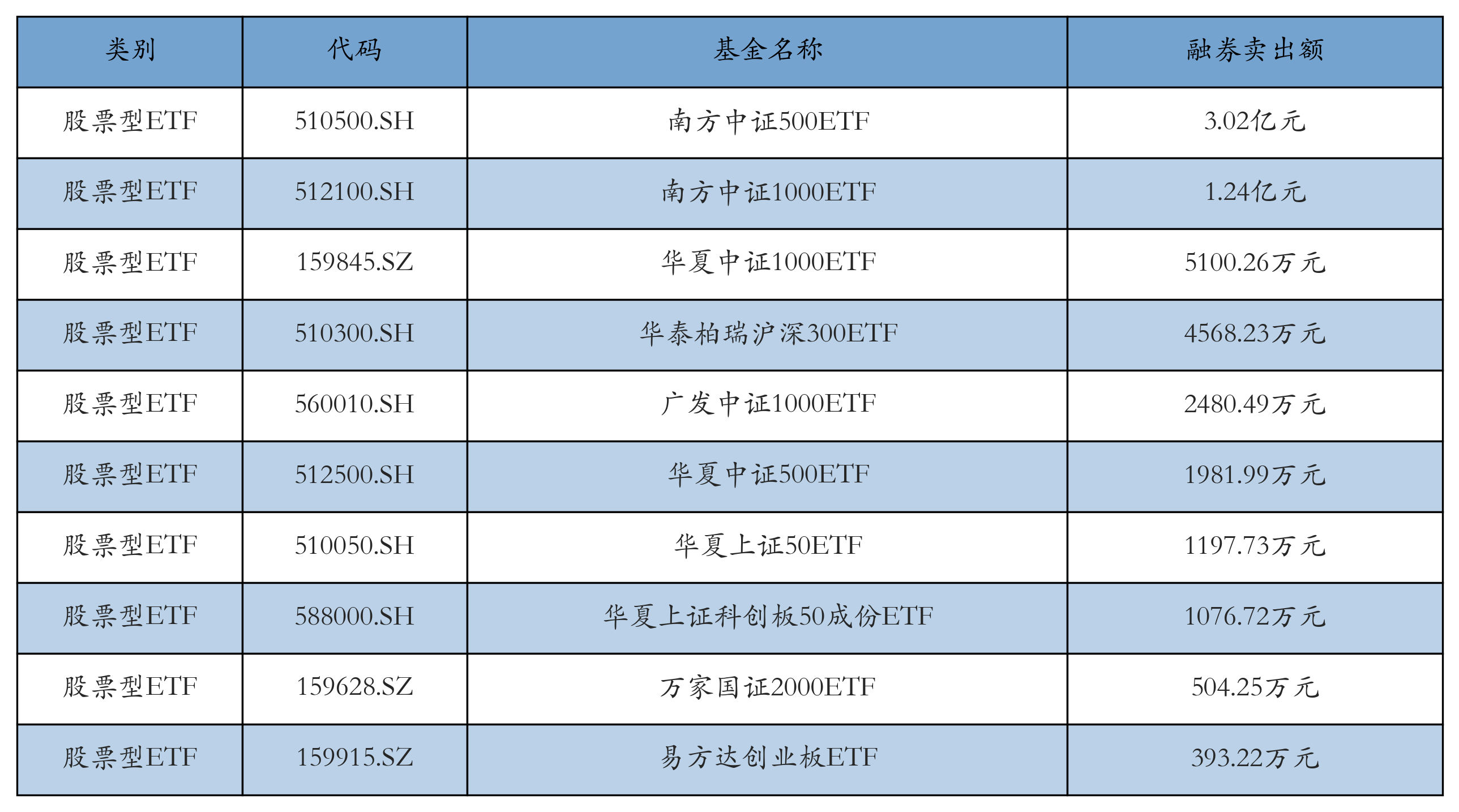 昨日股票型ETF融资卖出额最高的3只ETF及其卖出金额分别为:南方中证500ETF(3.02亿元)、南方中证1000ETF(1.24亿元)、华夏中证1000ETF(5100.26万元)。融券卖出额前10详情见下表:
