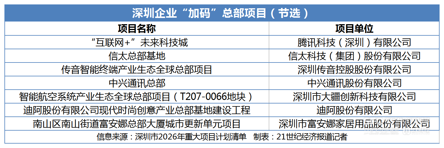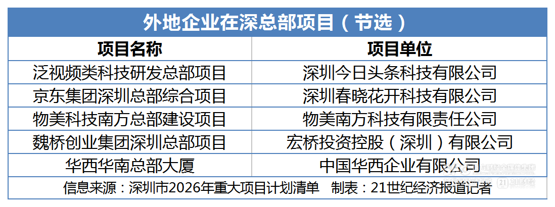 21世纪经济报道记者梳理发现,总部项目在《计划清单》中高频出现,既有本土企业重金“加仓”,包括腾讯“互联网+”未来科技城、大疆智能航空系统产业生态全球总部项目(T207-0066地块)、传音智能终端产业生态全球总部项目等;也有外地企业千里“南下”,例如抖音泛视频类科技研发总部项目、京东集团深圳总部综合项目、魏桥创业集团深圳总部项目等。
