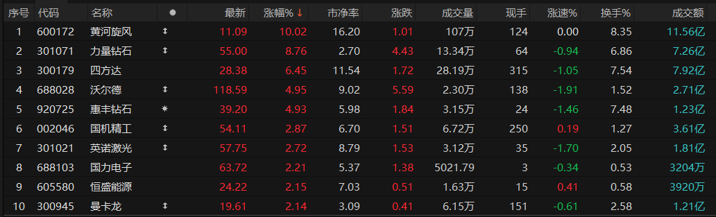 3月11日早盘,培育钻石概念快速拉升,黄河旋风2连板,力量钻石、四方达、惠丰钻石、沃尔德跟涨。