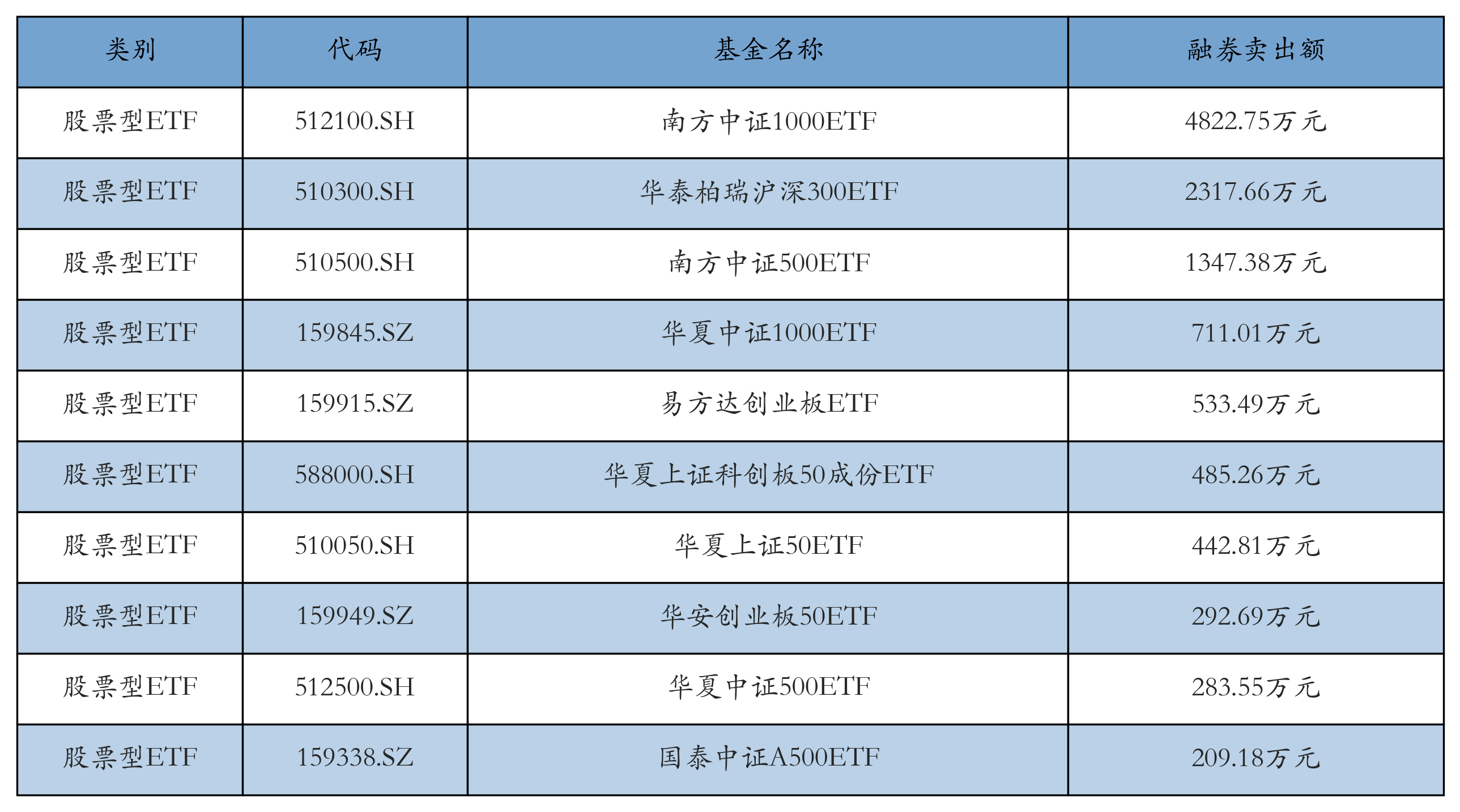 昨日股票型ETF融资卖出额最高的3只ETF及其卖出金额分别为:南方中证1000ETF(4822.75万元)、华泰柏瑞沪深300ETF(2317.66万元)、南方中证500ETF(1347.38万元)。融券卖出额前10详情见下表: