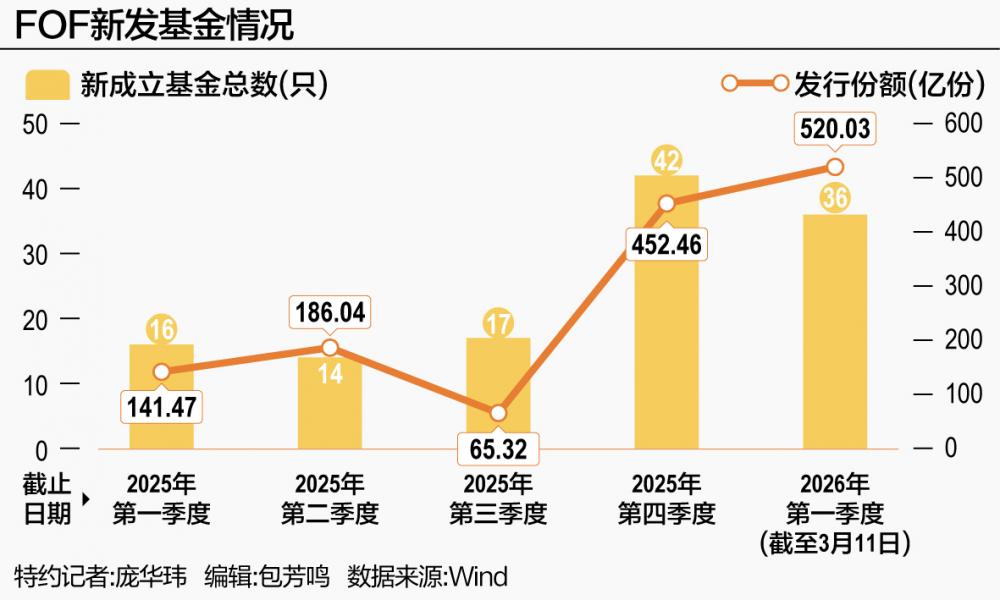截至3月11日,2026年以来新成立FOF达36只(仅计算主代码基金),合计规模已达520.03亿元,规模创下2021年四季度以来的新高。