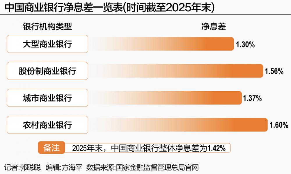 事实上,自2025年以来,在LPR多次下调、资产端收益率持续走低的背景下,银行净息差收窄压力加剧。国家金融管理总局数据显示,2025年末中国商业银行净息差为1.42%。其中大型商业银行净息差为1.30%,股份制商业银行净息差为1.56%,城市商业银行净息差为1.37%,农村商业银行净息差为1.60%。