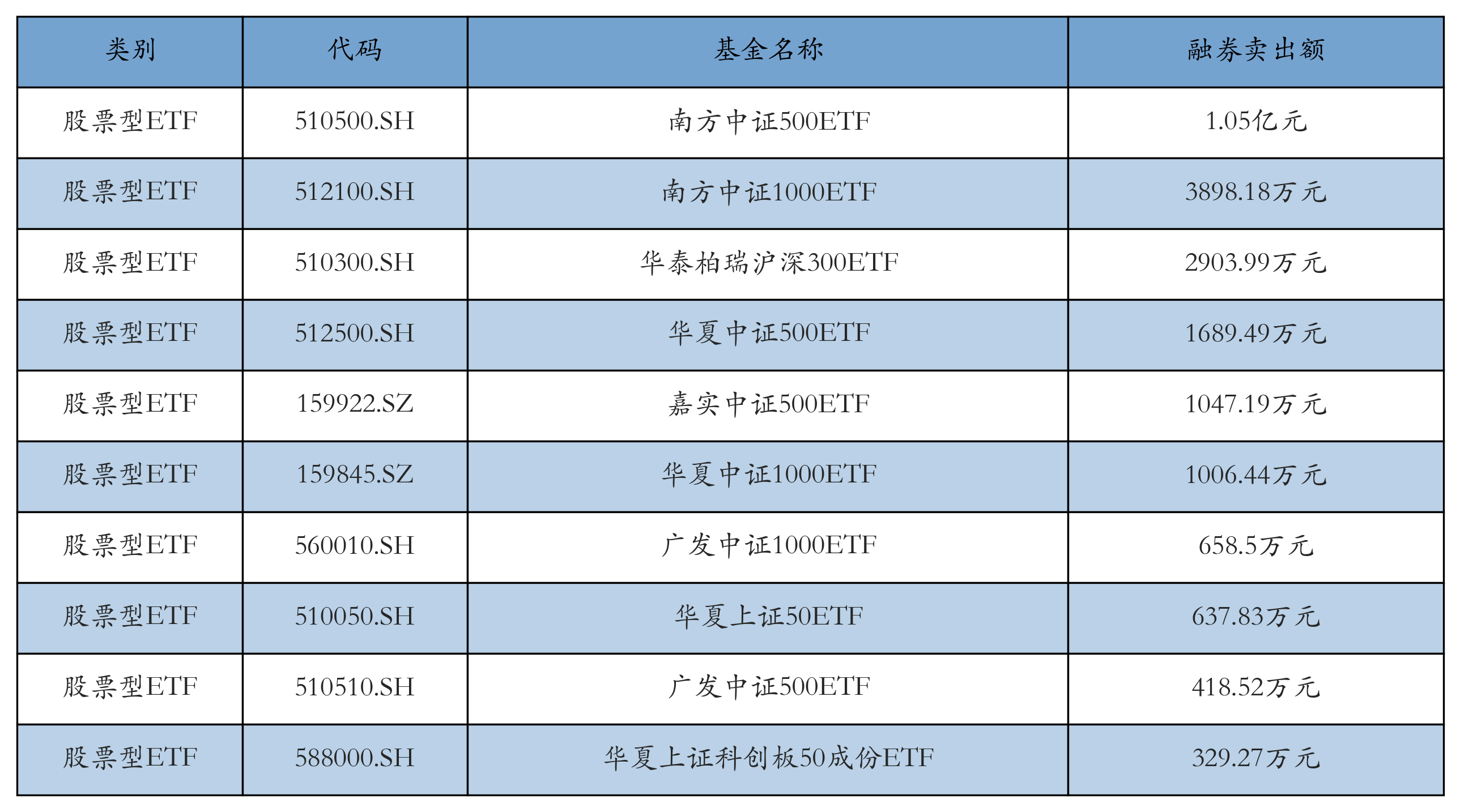 昨日股票型ETF融资卖出额最高的3只ETF及其卖出金额分别为:南方中证500ETF(1.05亿元)、南方中证1000ETF(3898.18万元)、华泰柏瑞沪深300ETF(2903.99万元)。融券卖出额前10详情见下表: