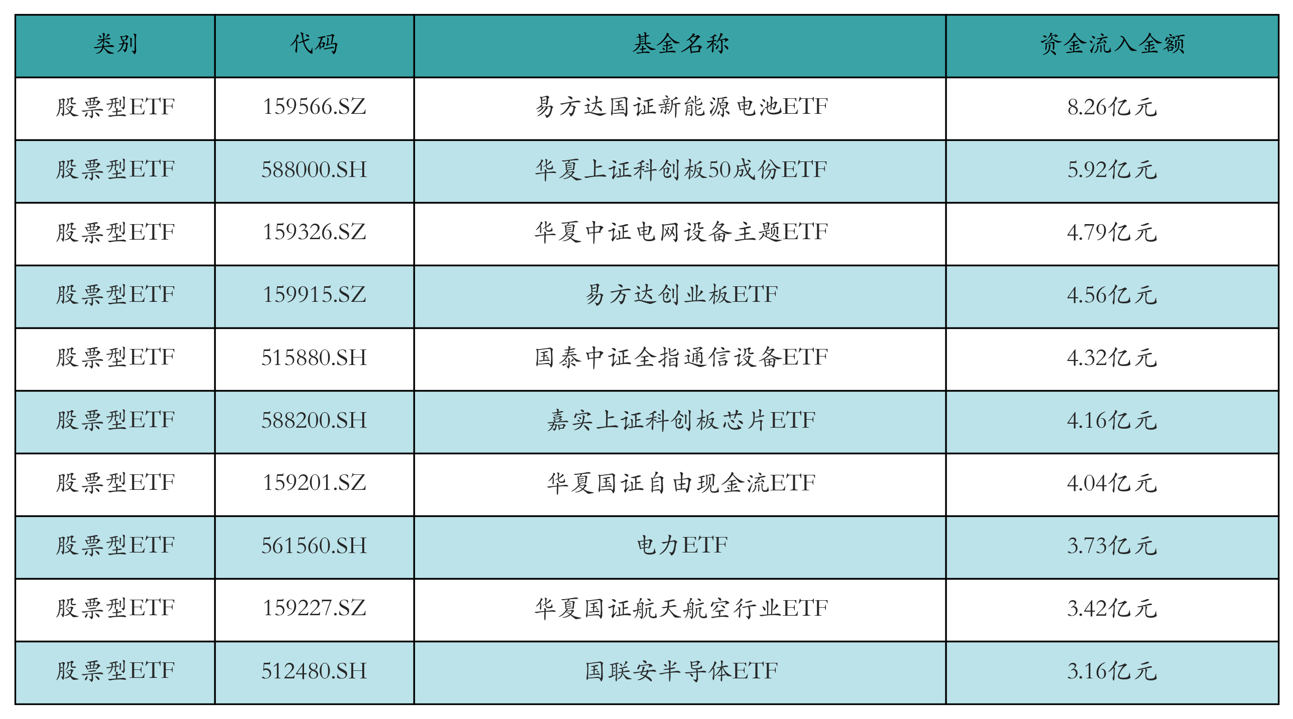 昨日股票型ETF资金流入最多的3只ETF及其流入金额分别为:易方达国证新能源电池ETF(流入8.26亿元)、华夏上证科创板50成份ETF(流入5.92亿元)、华夏中证电网设备主题ETF(流入4.79亿元)。资金流入前10详情见下表:
