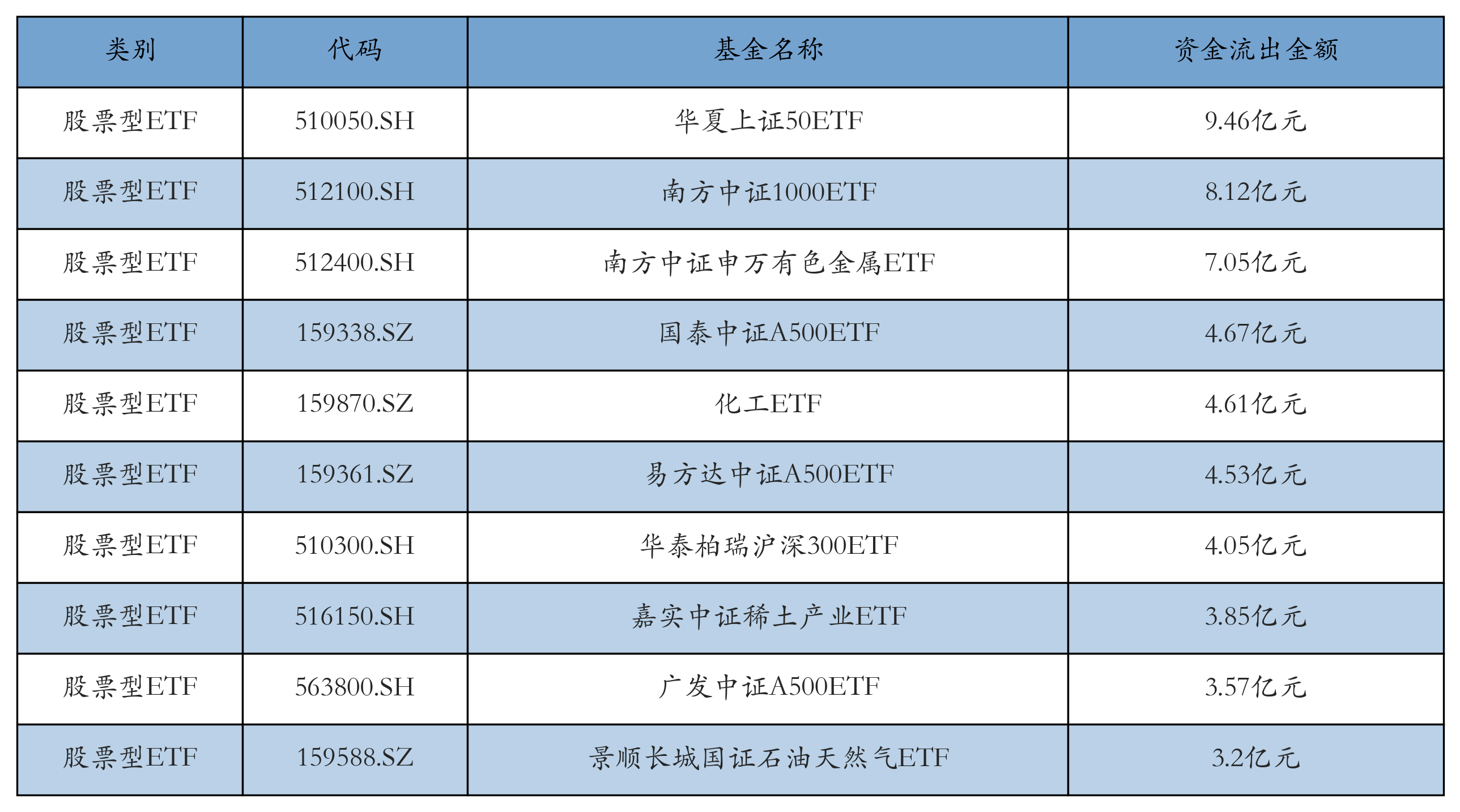 昨日股票型ETF资金流出最多的3只ETF及其流出金额分别为:华夏上证50ETF(流出9.46亿元)、南方中证1000ETF(流出8.12亿元)、南方中证申万有色金属ETF(流出7.05亿元)。资金流出前10详情见下表: