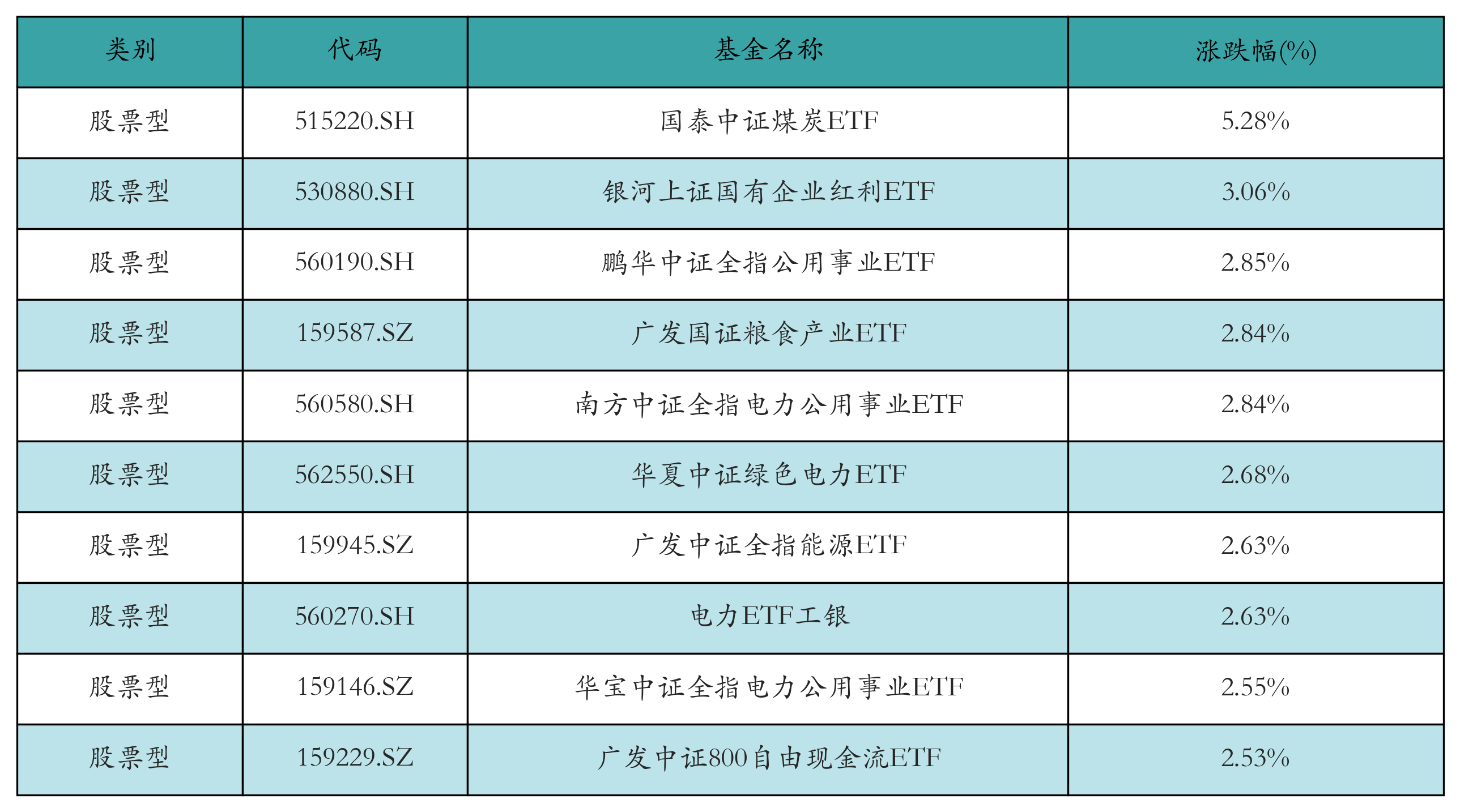 昨日股票型ETF涨幅最高的3只ETF及其收益率分别为:国泰中证煤炭ETF(5.28%)、银河上证国有企业红利ETF(3.06%)、鹏华中证全指公用事业ETF(2.85%)。涨幅前10详情见下表: