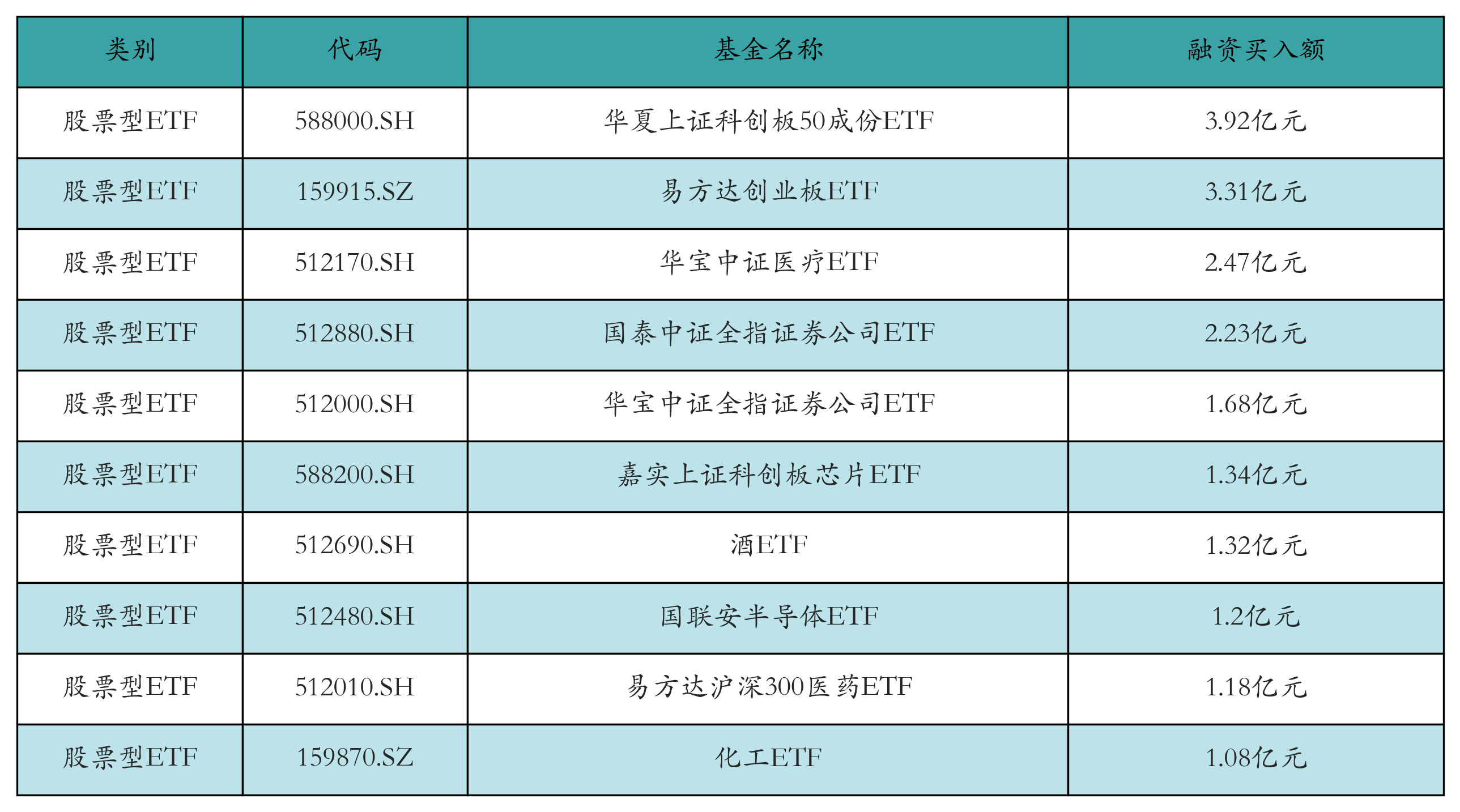 昨日股票型ETF融资买入额最高的3只ETF及其买入金额分别为:华夏上证科创板50成份ETF(3.92亿元)、易方达创业板ETF(3.31亿元)、华宝中证医疗ETF(2.47亿元)。融资买入额前10详情见下表: