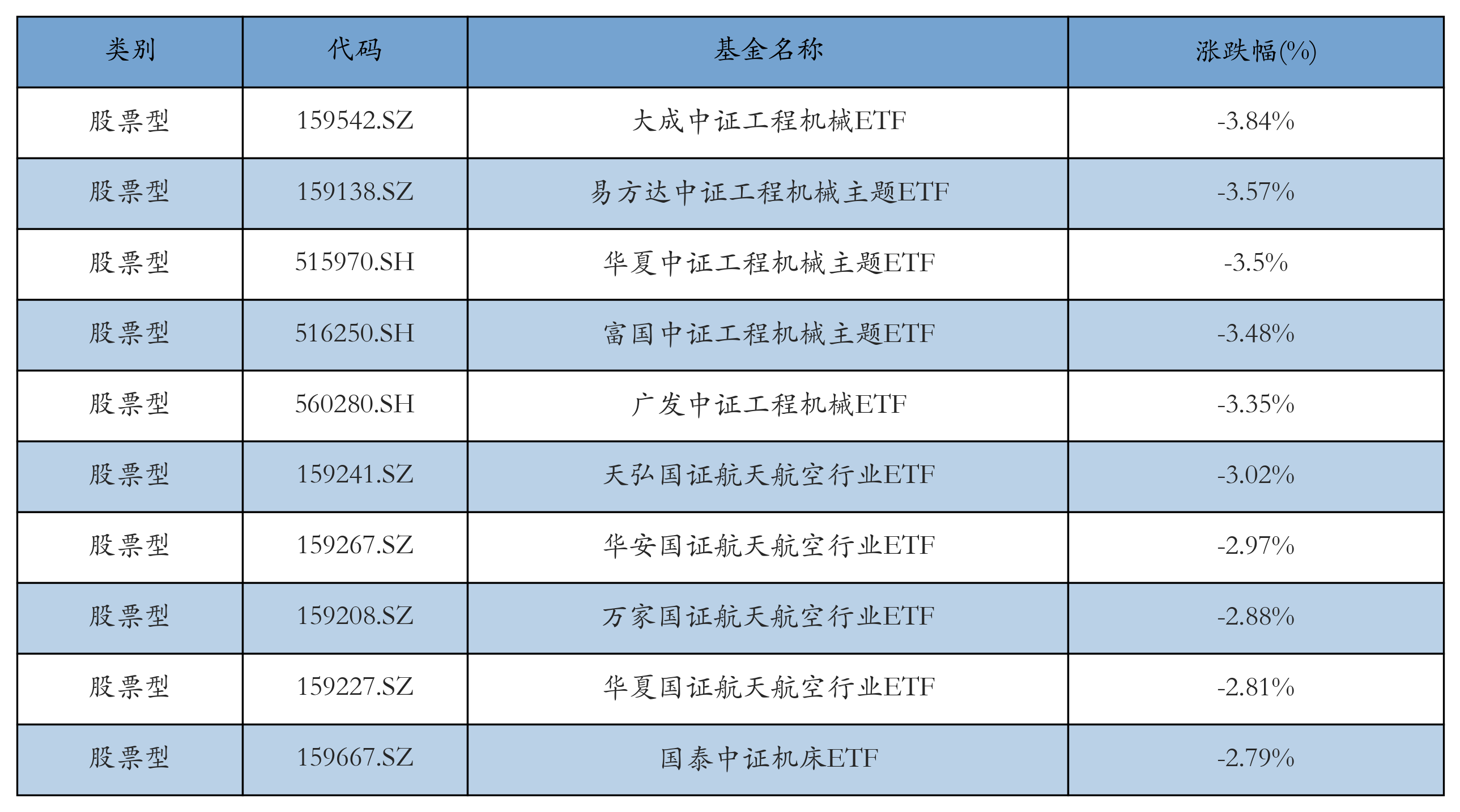 昨日股票型ETF跌幅最大的3只ETF及其收益率分别为:大成中证工程机械ETF(-3.84%)、易方达中证工程机械主题ETF(-3.57%)、华夏中证工程机械主题ETF(-3.5%)。跌幅前10详情见下表:
