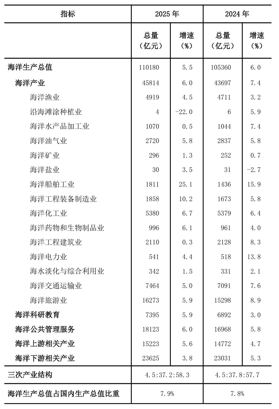 《公报》显示,初步核算,2025年全国海洋生产总值110180亿元,比上年增长5.5%,占国内生产总值比重为7.9%,比上年高0.1个百分点。2025年海洋经济呈现稳中有进势头,不断拉动国民经济增长。