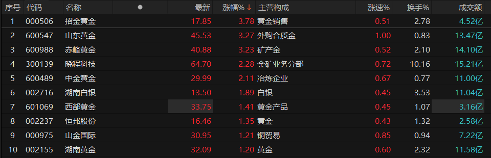 贵金属板块午后逆势走强,涨幅扩大超2%,其中招金黄金、赤峰黄金、山东黄金涨超3%。