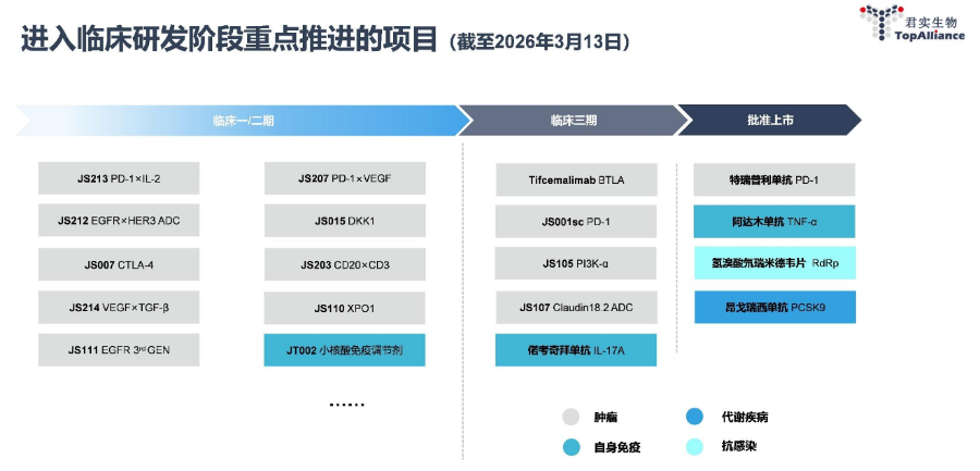- 早期管线布局例如PD-1/IL-2融合蛋白(JS213)、CD20/CD3双抗(JS203)等管线的临床开发也在持续进行。