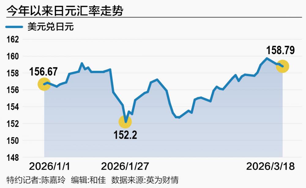 随着美以对伊朗实施军事打击,3月以来,日元兑美元汇率走弱,一度触及1美元兑159.76日元,创下2024年7月日本政府干预汇市以来的最弱水平,并持续在160“关口”下方徘徊——160被市场广泛视为日本政府干预汇市的警戒线。3月18日,截至东京时间下午5点,日元汇率为1美元兑158.79日元。进入欧洲交易时段后,日元贬值,汇率一度回到159的位置。