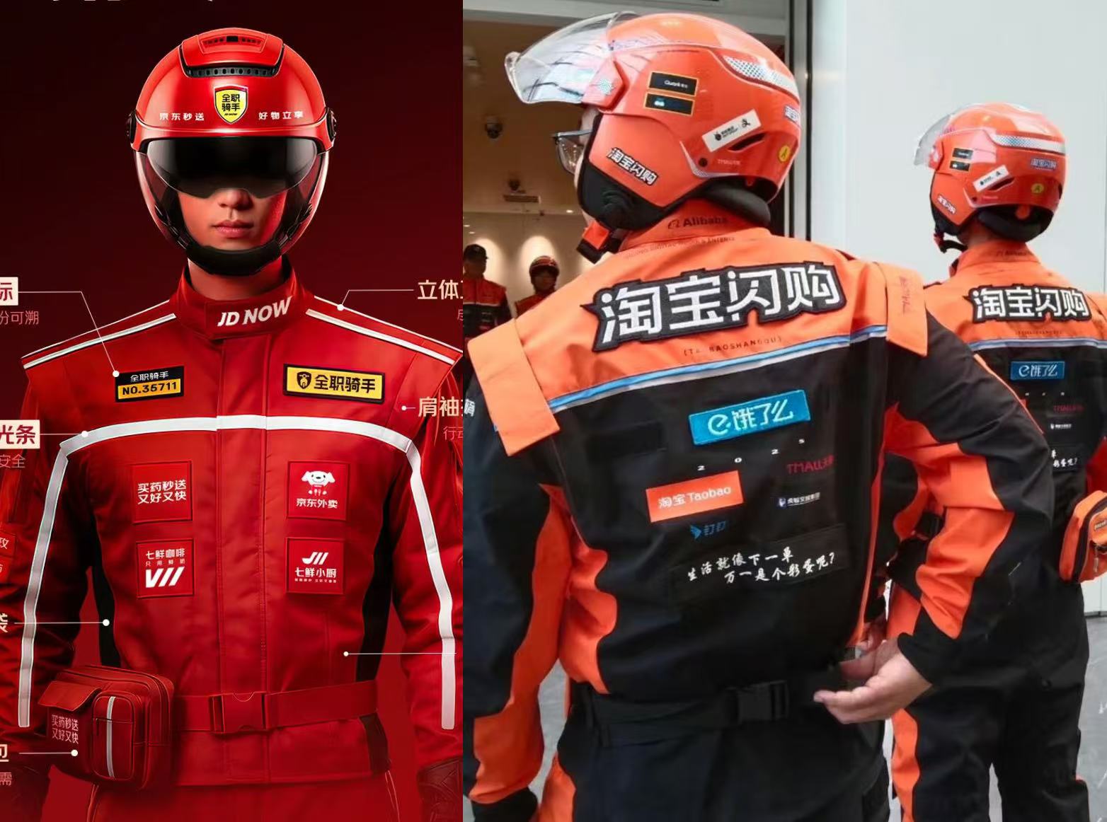 京东外卖新工服流线剪裁+银色反光条,胸前金色工号牌神似赛车编号,被戏称"外卖界法拉利"。去年8月,淘宝闪购推出新工服,因橙黑配色与造型被调侃成"迈凯伦风",因此网友戏称,京东与淘宝闪购外卖服是“红色法拉利VS橙色迈凯伦”的红橙对决。
