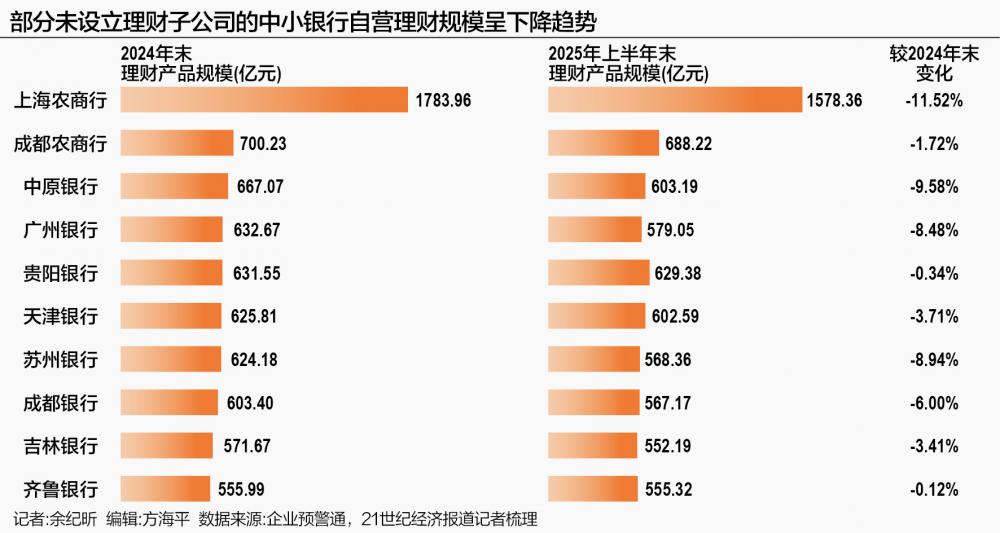 记者梳理企业预警通数据发现,未设理财子公司的中小银行自营理财规模在2024年至2025年间呈现整体下行趋势。