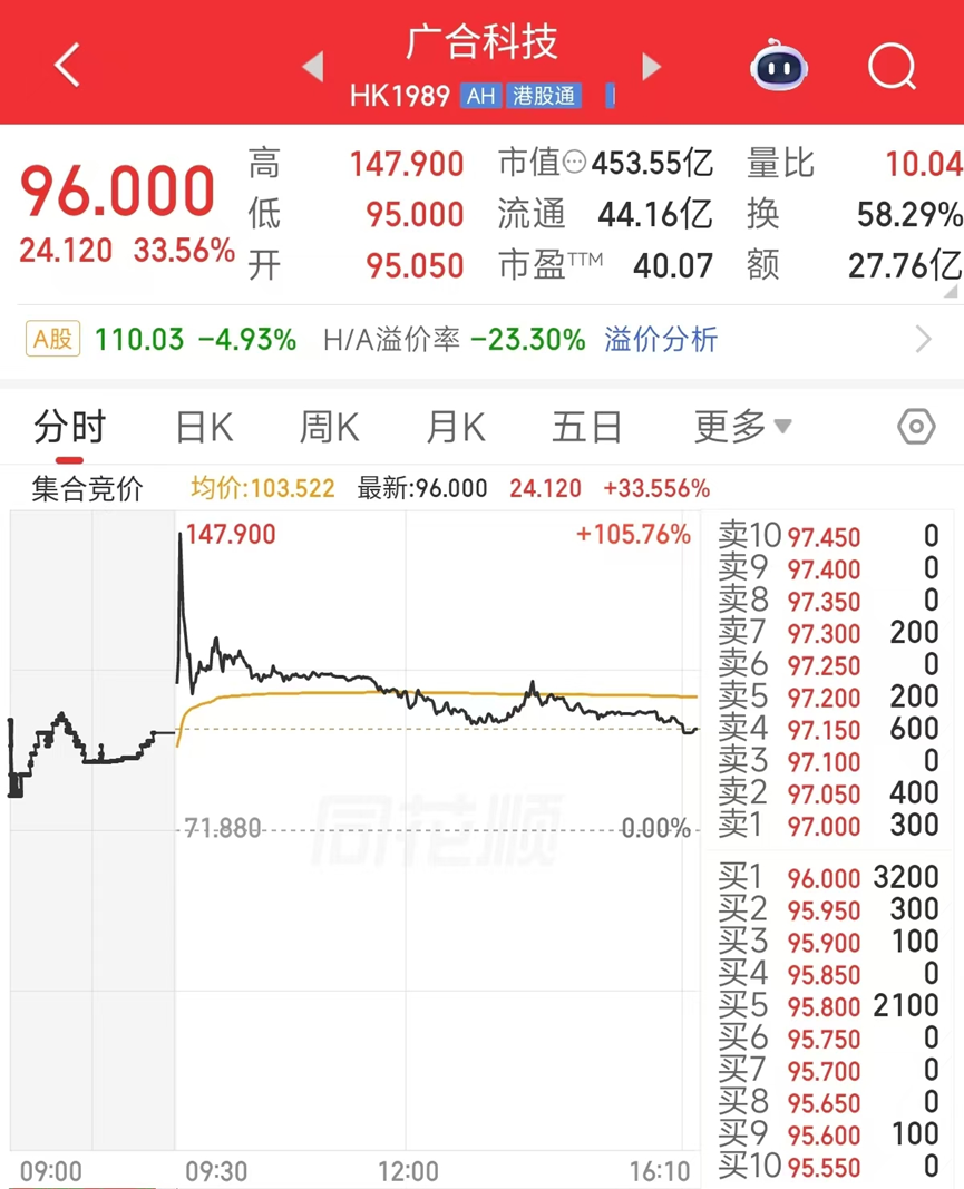 3月20日,广合科技(1989.HK)在港交所上市,盘中最高涨幅为105.76%至147.9港元,尾盘回落报收96港元,涨幅33.56%。截至收盘,港股市值为453.55亿港元,H/A溢价率为-23.3%。