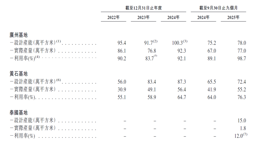 然而,海外产能仍在缓慢推进。截至2025年前九个月,泰国基地设计产能为15万平方米,实际利用率仅有12%,远低于同期广州基地的98.7%和黄石基地的76.3%。