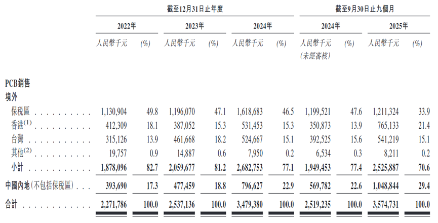 从营收结构来看,广合科技PCB销售境外收入长期维持在七成之上。其中,应客户出于商业方面考虑要求,近半数PCB产品被运送至保税区。