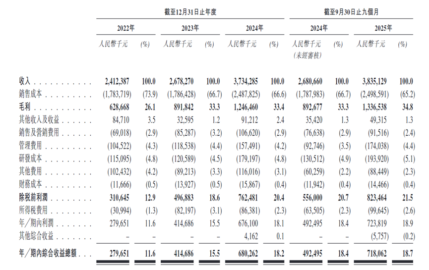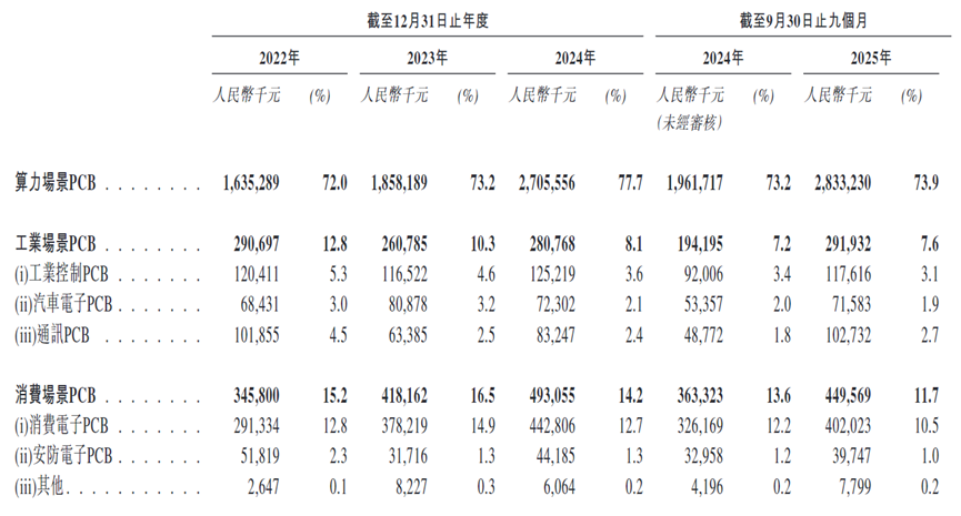 根据招股书,2022年、2023年、2024年及2025年前三季度,广合科技来自算力场景PCB的收入分别约为16.3亿元、18.6亿元、27.1亿元及28.3亿元人民币,占同期总收入的67.8%、69.4%、72.5%及73.9%。