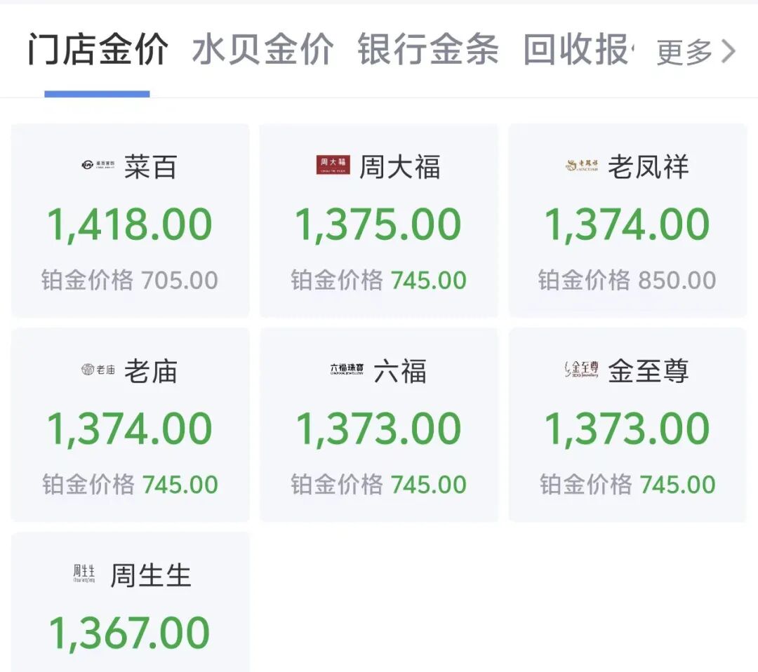 今早,多品牌纷纷调整足金饰品价格,老庙黄金、周大福、六福珠宝、潮宏基黄金价格均跌至1400元/克以下。