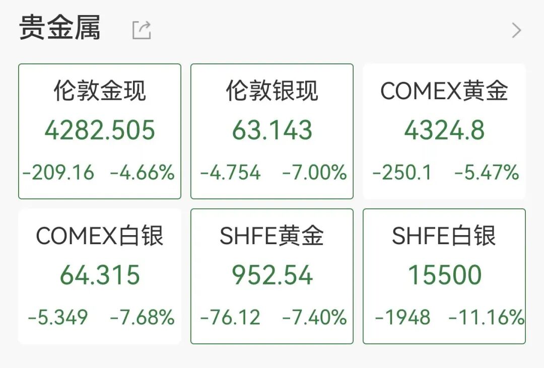 截至发稿,现货黄金日内下跌超4.66%,失守4300美元/盎司大关,抹去2026年全年涨幅,今年以来现货黄金年涨幅最高一度至近30%,但3月以来,现货黄金价格已重挫超1000美元。纽约期金失守4340美元/盎司,日内跌5.47%。现货白银向下跌至63美元/盎司,日内下跌7%。