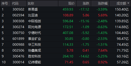 个股方面,新易盛成交额超150亿元居首,比亚迪、中际旭创、阳光电源成交额靠前。