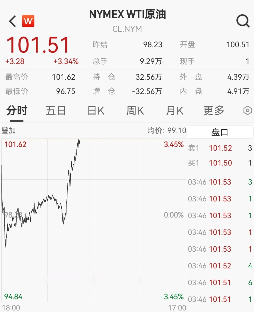 WTI原油同步走强,涨超101美元/桶,涨幅超3%。