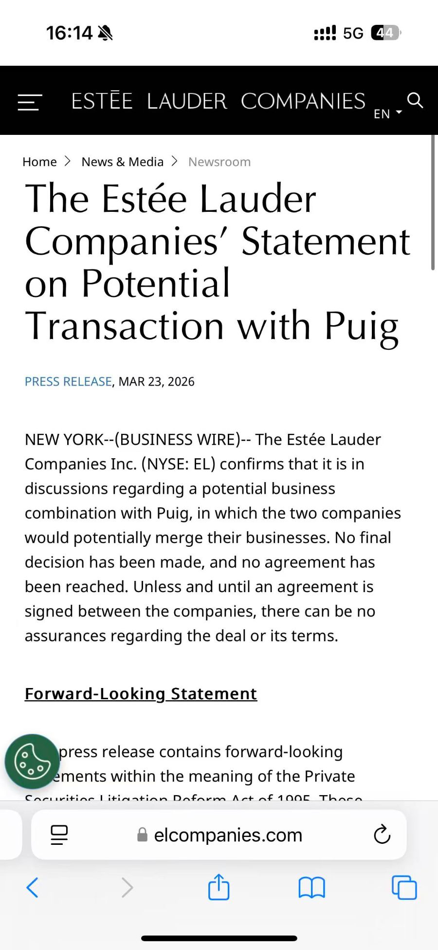 3月24日,美国美妆巨头雅诗兰黛与西班牙美妆集团Puig证实正洽谈合并事宜,尽管目前尚未达成最终协议,但此次洽谈标志着高端美妆领域格局或将迎来重大变革。该消息引发雅诗兰黛股价大幅震荡,创去年6月以来新低。