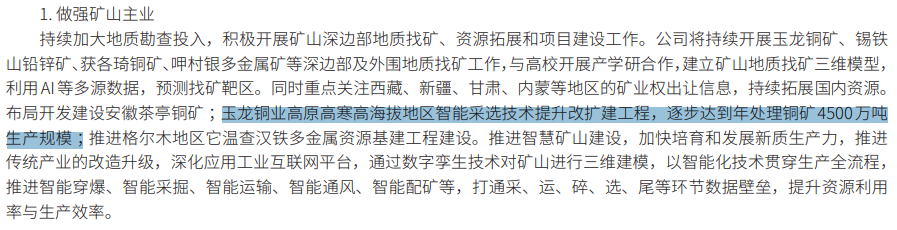 根据年报,玉龙铜业高原高寒高海拔地区智能采选技术提升改扩建工程,逐步达到年处理铜矿4500万吨生产规模。