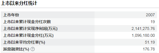 进一步对比历史分红数据,还可以看出公司2007年上市以来已经分红19亿元,累计分红金额109.6亿元,平均分红率达到51%。
