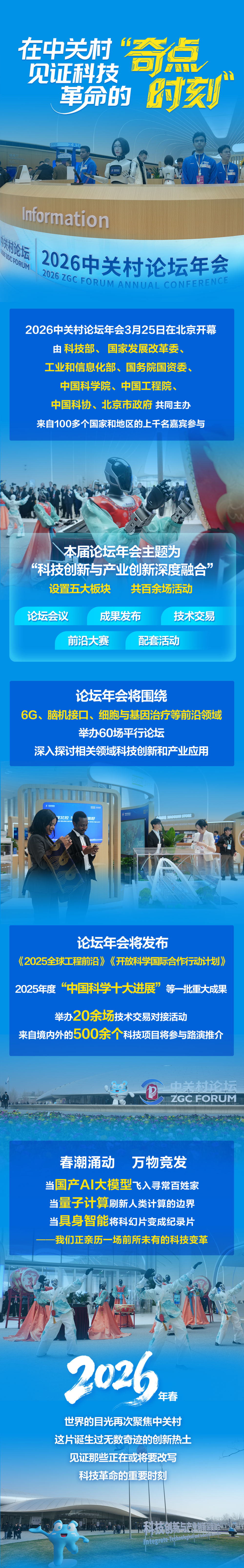 2026中关村论坛年会于3月25日至29日在京举办。本次年会为期5天,以“科技创新与产业创新深度融合”为主题,设置论坛会议、成果发布等五大板块,共百余场活动,来自100多个国家和地区的上千名嘉宾参与。
