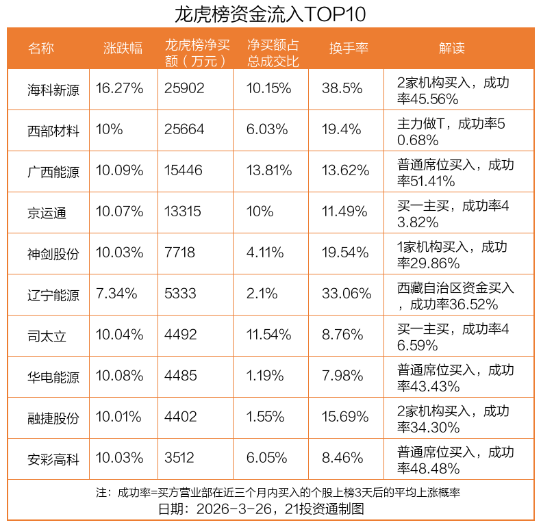 3月26日,上证指数下跌1.09%,深证成指下跌1.41%,创业板指下跌1.34%。盘后龙虎榜数据显示,共有46只个股因当日异动登上龙虎榜,资金净流入最多的是海科新源(301292.SZ),达2.59亿元。