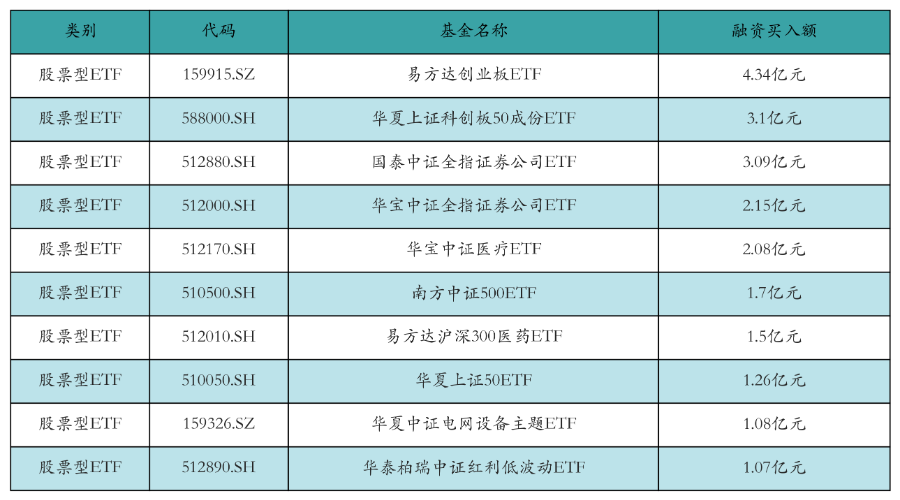 昨日股票型ETF融资买入额最高的3只ETF及其买入金额分别为:易方达创业板ETF(4.34亿元)、华夏上证科创板50成份ETF(3.1亿元)、国泰中证全指证券公司ETF(3.09亿元)。融资买入额前10详情见下表: