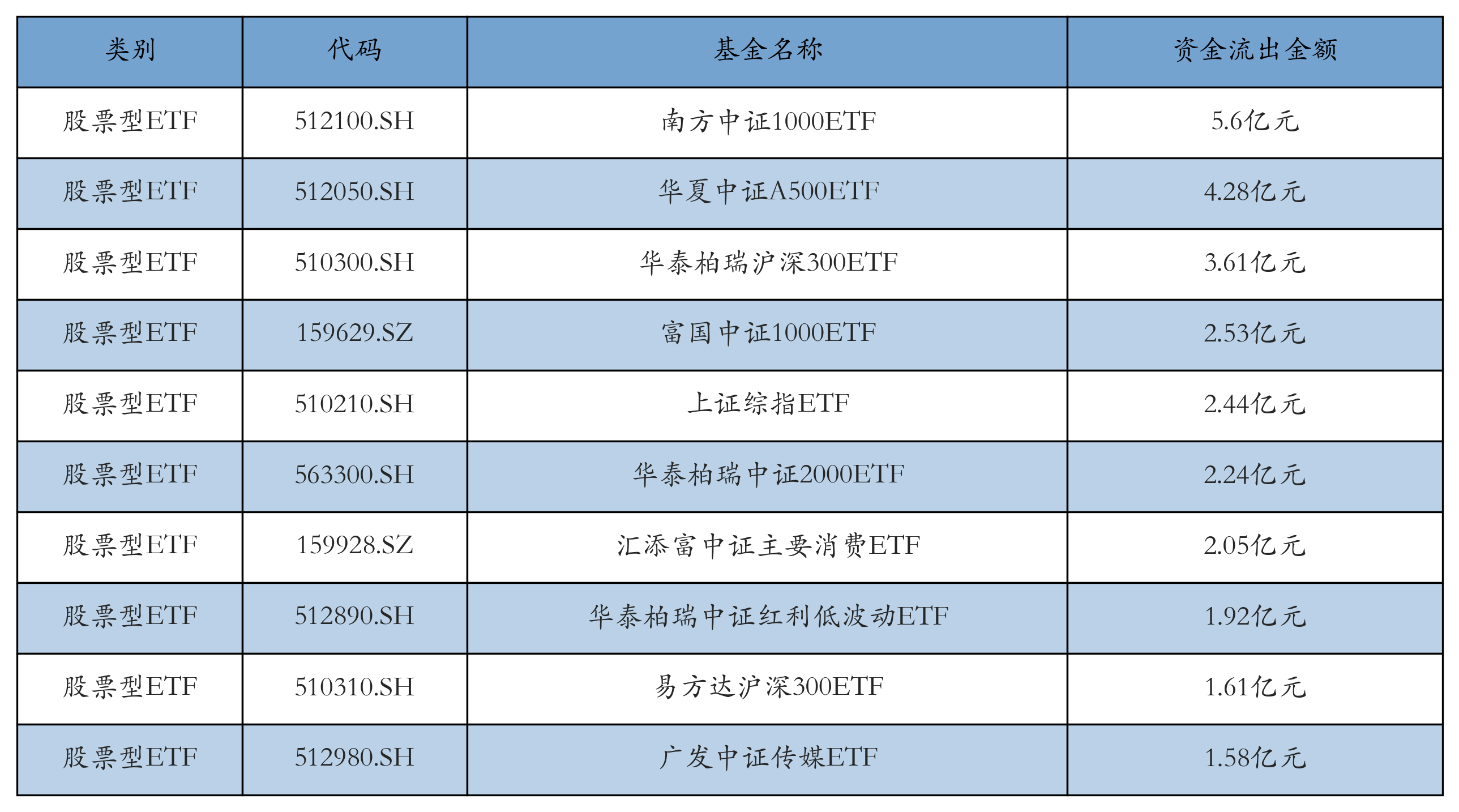 昨日股票型ETF资金流出最多的3只ETF及其流出金额分别为:南方中证1000ETF(流出5.6亿元)、华夏中证A500ETF(流出4.28亿元)、华泰柏瑞沪深300ETF(流出3.61亿元)。资金流出前10详情见下表: