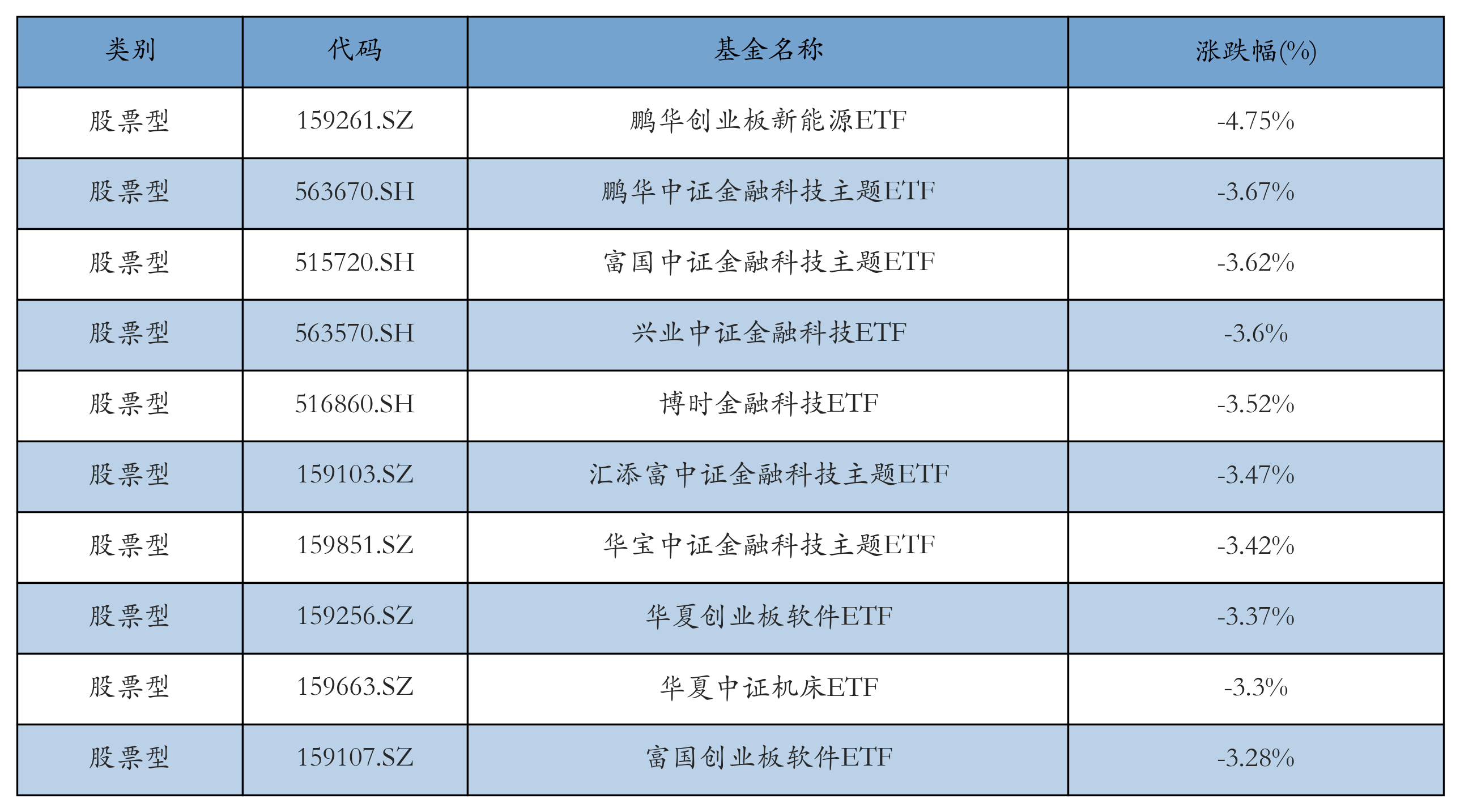 昨日股票型ETF跌幅最大的3只ETF及其收益率分别为:鹏华创业板新能源ETF(-4.75%)、鹏华中证金融科技主题ETF(-3.67%)、富国中证金融科技主题ETF(-3.62%)。跌幅前10详情见下表: