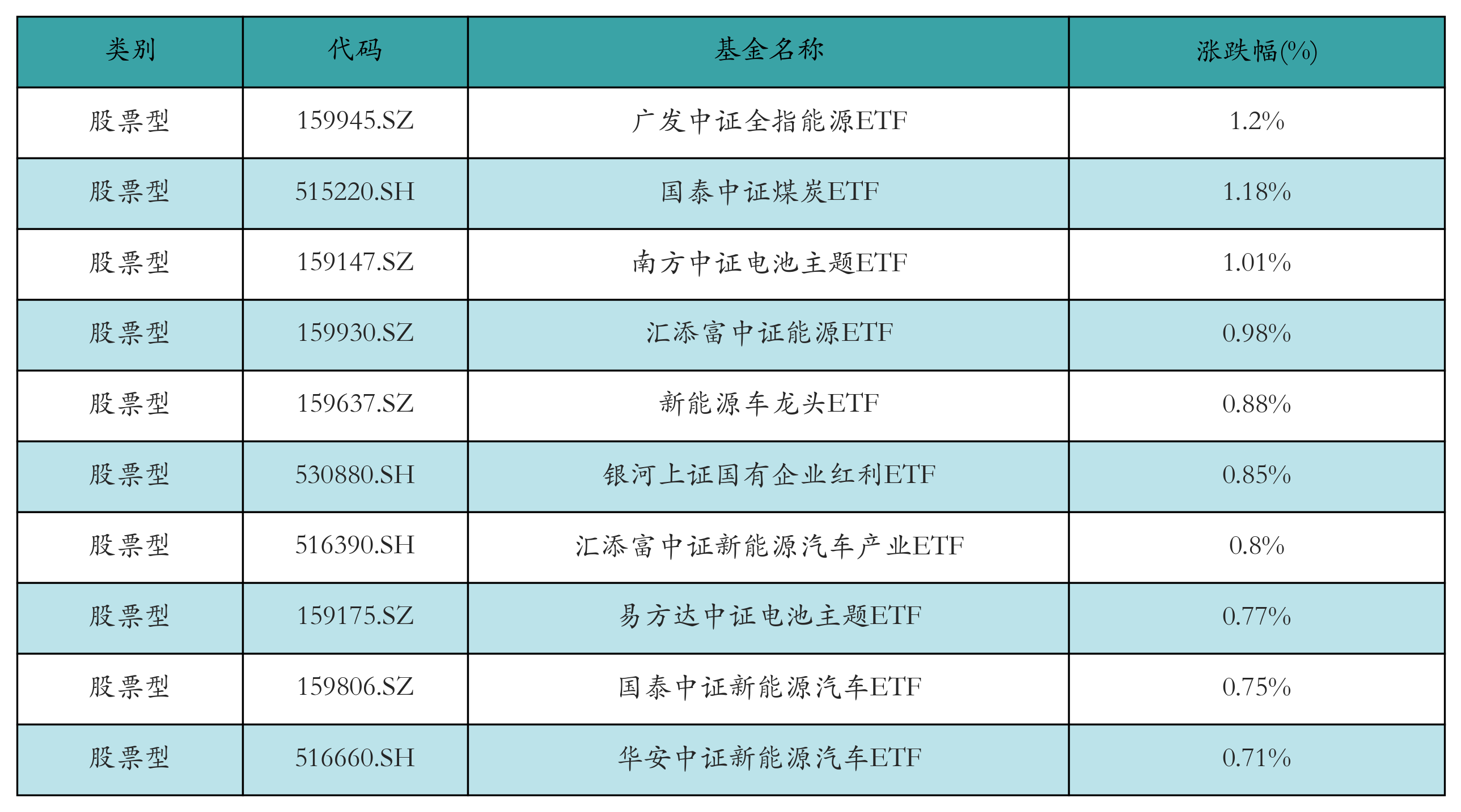 昨日股票型ETF涨幅最高的3只ETF及其收益率分别为:广发中证全指能源ETF(1.2%)、国泰中证煤炭ETF(1.18%)、南方中证电池主题ETF(1.01%)。涨幅前10详情见下表:
