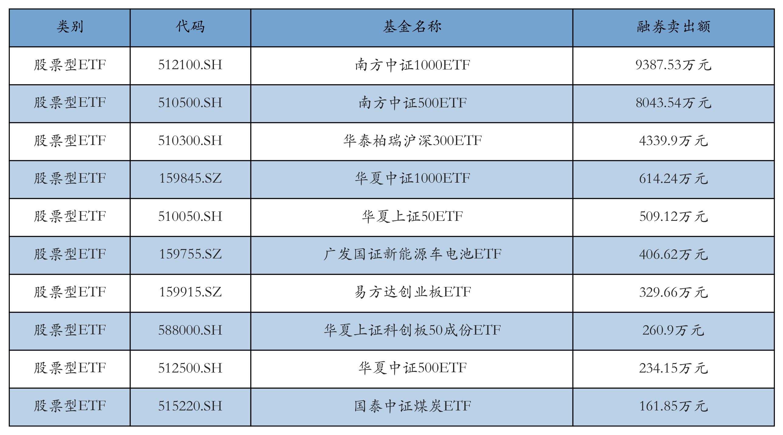 昨日股票型ETF融资卖出额最高的3只ETF及其卖出金额分别为:南方中证1000ETF(9387.53万元)、南方中证500ETF(8043.54万元)、华泰柏瑞沪深300ETF(4339.9万元)。融券卖出额前10详情见下表: