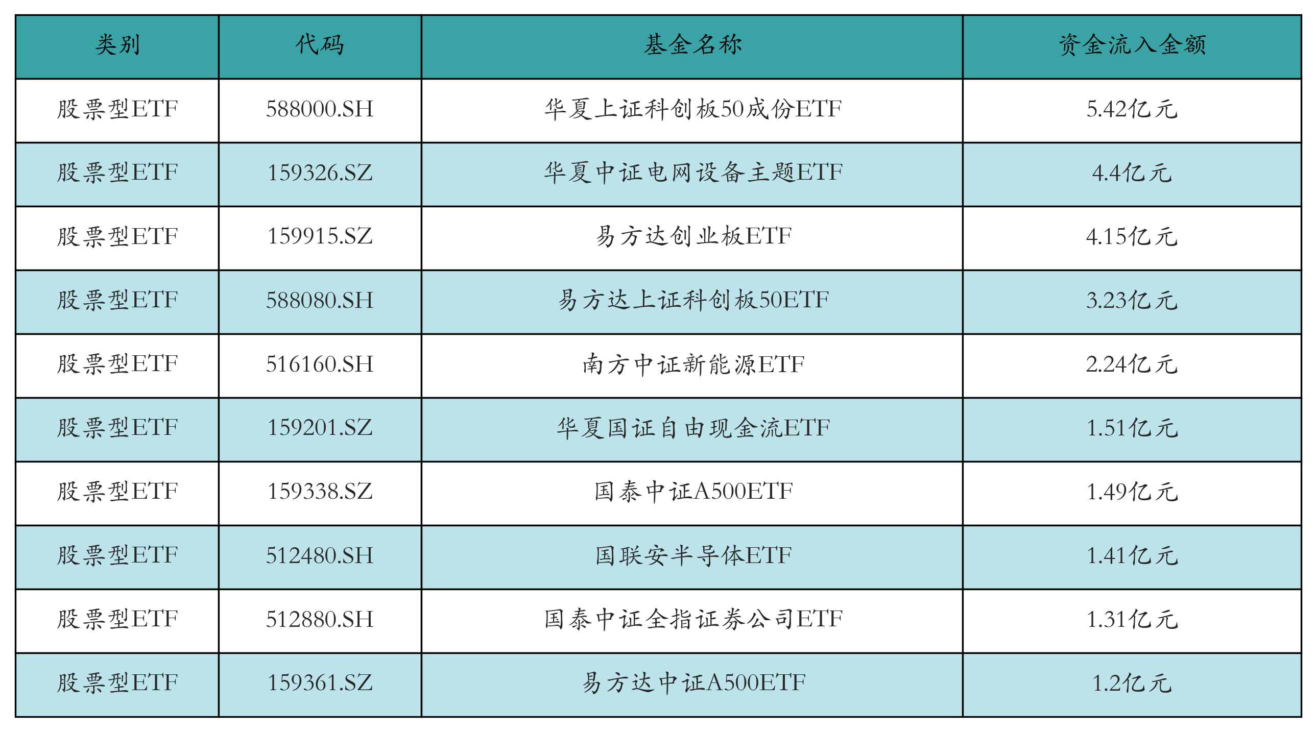昨日股票型ETF资金流入最多的3只ETF及其流入金额分别为:华夏上证科创板50成份ETF(流入5.42亿元)、华夏中证电网设备主题ETF(流入4.4亿元)、易方达创业板ETF(流入4.15亿元)。资金流入前10详情见下表: