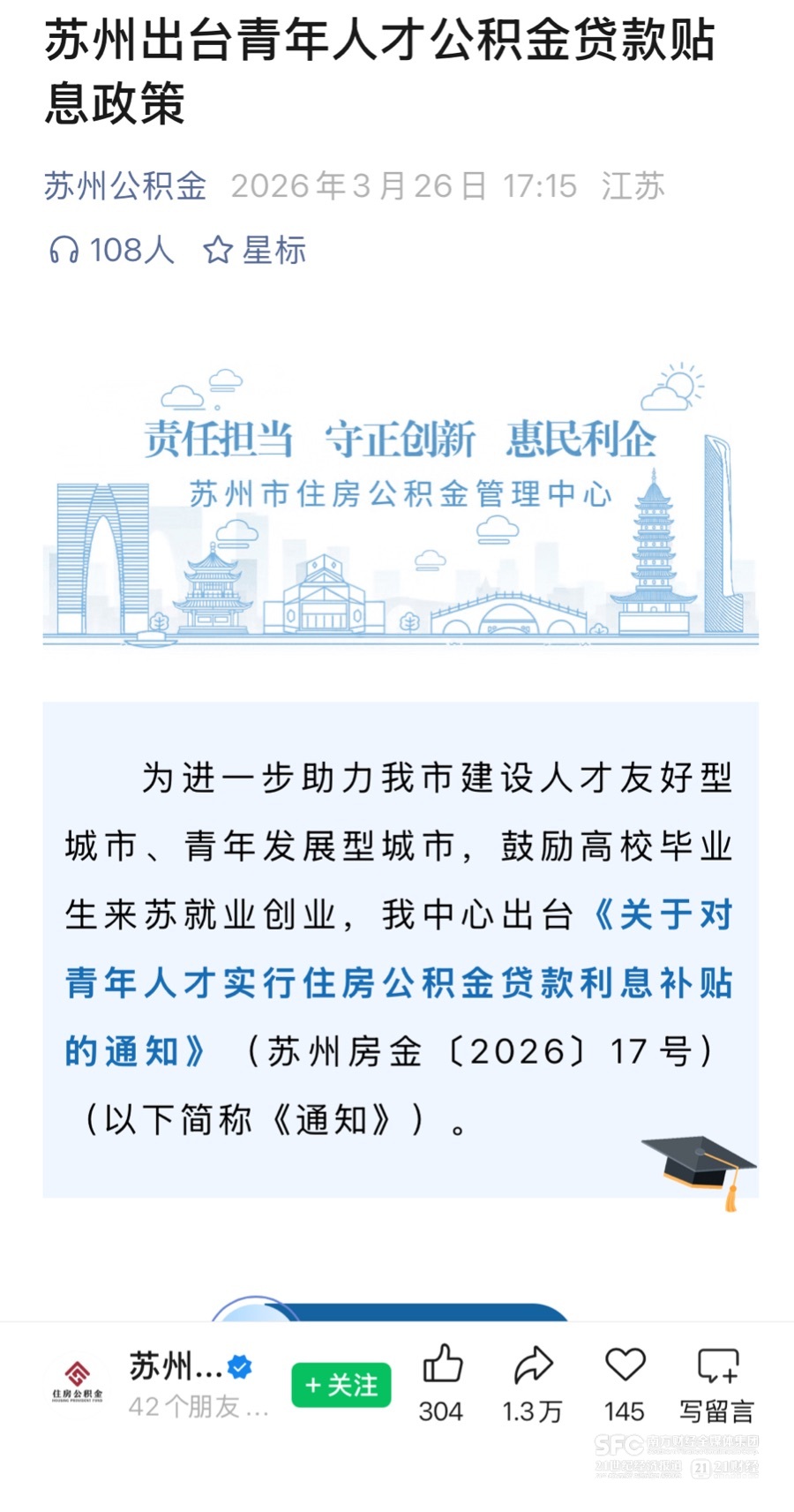 3月26日,苏州市住房公积金管理中心发布《关于对青年人才实行住房公积金贷款利息补贴的通知》(苏州房金〔2026〕17号)(以下简称《通知》),对符合条件的青年人才新申请公积金贷款实施为期12个月的利息补贴,补贴比例达实际还款利息的50%,单笔上限5万元。
