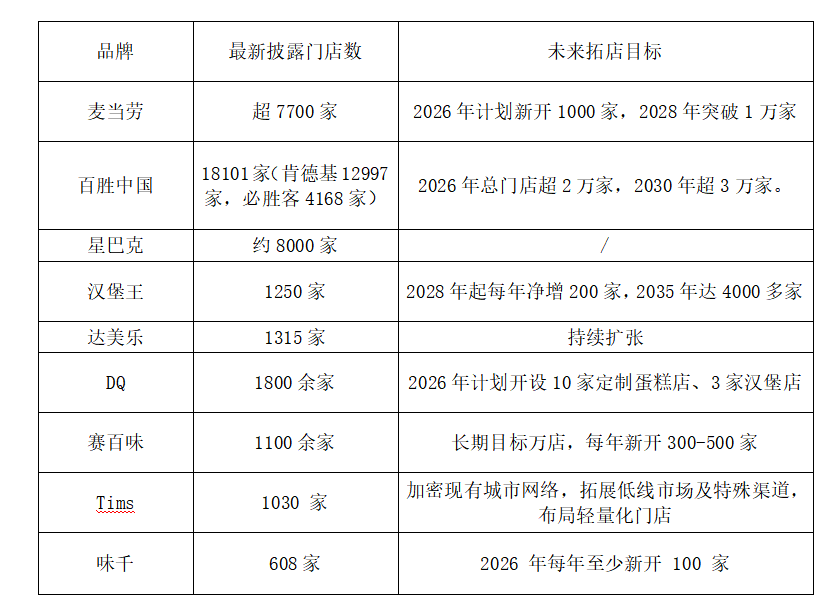 而老牌如麦当劳、肯德基也丝毫没有减速,分别在2025年净增约880家门店和1349家门店。麦当劳更是计划在2026年新开1000家,2028年预计总量突破一万家,持续保持高速扩张的趋势。