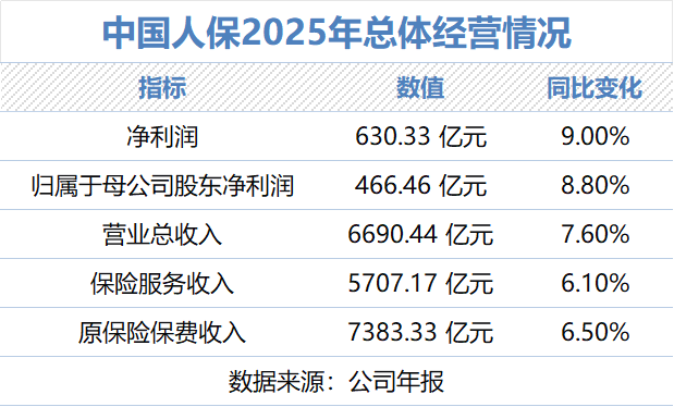 2026年3月26日,中国人民保险集团股份有限公司(股票代码:601319.SH,01339.HK,以下简称“中国人保”)发布2025年年度报告。年报显示,2025年中国人保实现净利润630.33亿元,同比增长9.0%;归属于母公司股东净利润466.46亿元,同比增长8.8%。