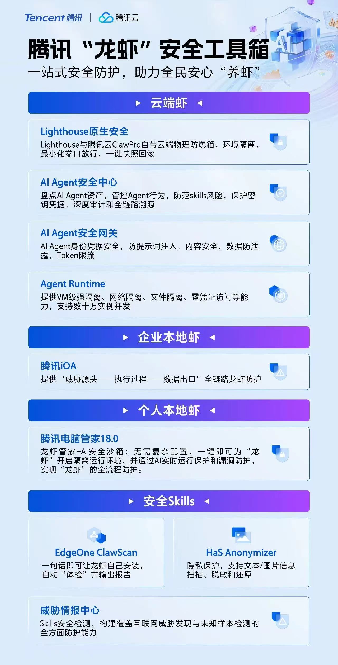 为解决龙虾带来的安全挑战,腾讯推出OpenClaw安全工具箱,无论是云端还是本地部署的企业或个人,都能获得升级的专属架构和安全能力。同时,腾讯还将安全能力封装成AI Skills,上架ClawHub、SkillHub社区,用户通过对话就能让“小龙虾”实现自我防护。